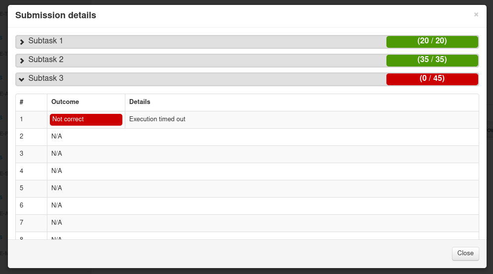 Når en test i en subtask feiler, får vi ikke noe poeng for den subtasken, og serveren hopper over å kjøre noen flere tester i den subtasken.
