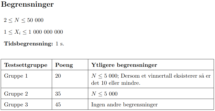 I oppgaveteksten står det oppgitt en liste med begrensninger, som gir visse garantier om hva slags input programmet kan bli testet på. I tillegg er testene inndelt i grupper, der noen av gruppene har strengere begrensninger på testenes input. Dersom programmet ditt klarer alle testene i en gruppe, får den poeng for den gruppa, uavhengig av hvordan programmet gjør det på testene i de andre gruppene. Grupper med strengere begrensninger vil generelt være lettere å løse, siden programmet får flere garantier om hvordan input ser ut. Selv om en oppgave totalt sett er for vanskelig, kan du skrive programmer som kun fungerer på noen av testgruppene, og likevel få noen poeng. Derfor kalles testgrupper også for subtasks.
