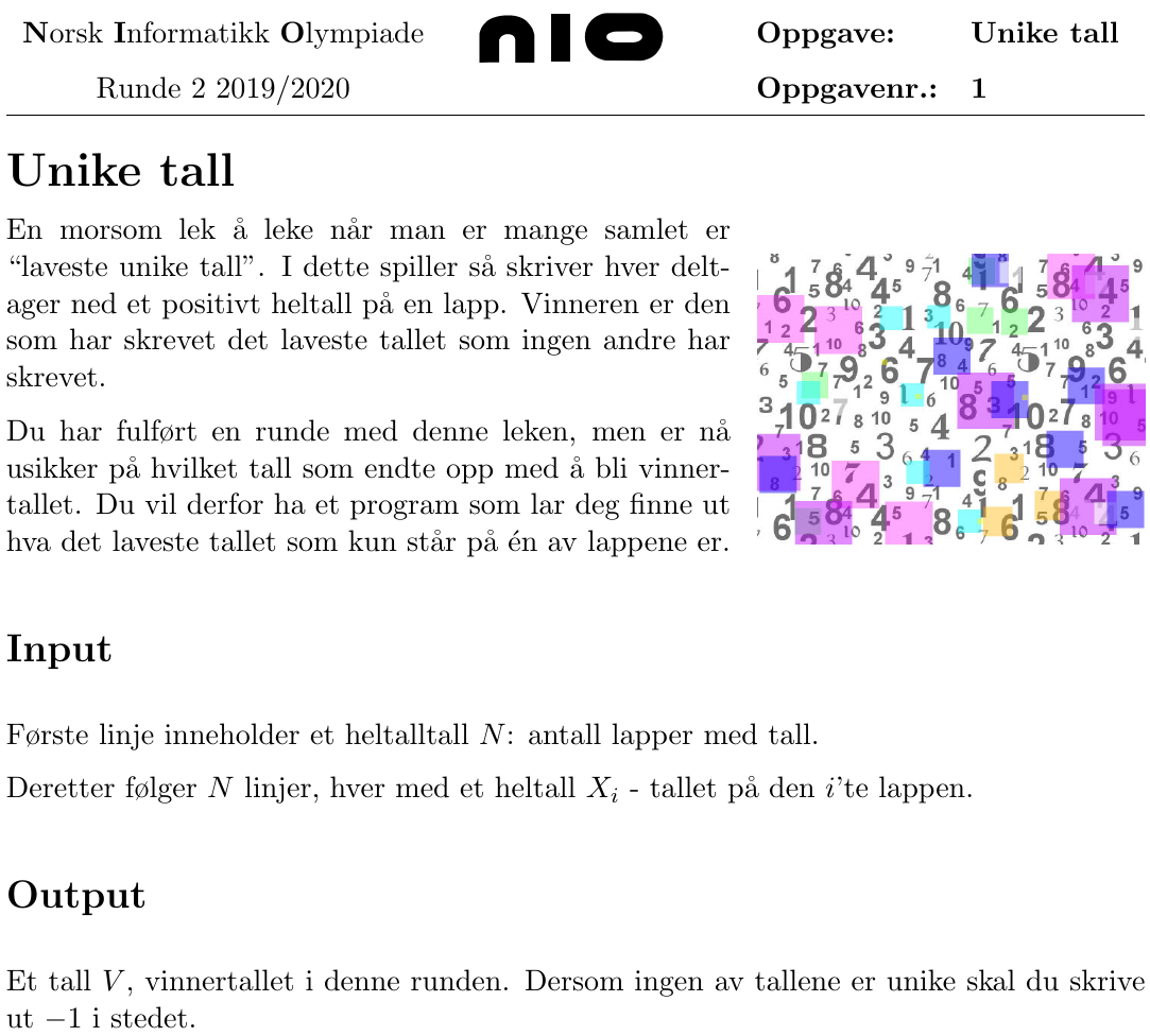 Oppgaveteksten beskriver oppgaven som programmet ditt skal kunne løse: “Gitt en liste med positive heltall, finn det laveste tallet som kun forekommer én gang i listen”. Besvarelsen din skal være et program som løser dette problemet for en hvilken som helst liste. Du får oppgitt en presis beskrivelse av formatet til input som programmet må lese inn, og en beskrivelse av output som programmet må printe ut når det har funnet svaret. Lenger ned i oppgaveteksten vil du se eksempler på tester programmet ditt skal evalueres på: